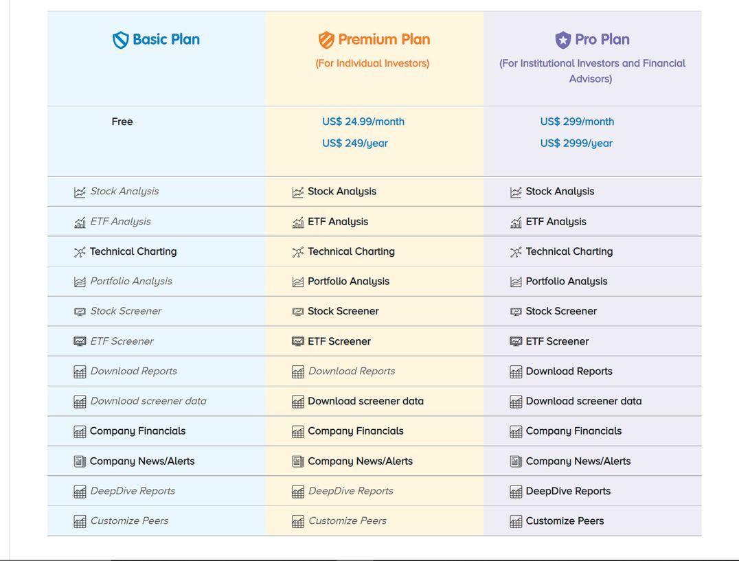Coming to the pricing and Plans, the Basic Plan is for free but does not offer much value. In order to screen stocks and obtain the result, you need to purchase the Premium plan for 24.99$ per month. On the other hand, the Pro pack can get very expensive at 299$ per month or 2999$ annually. Although it gives access to all the features present on the platform, still it might seem overpriced for the content and value it provides.