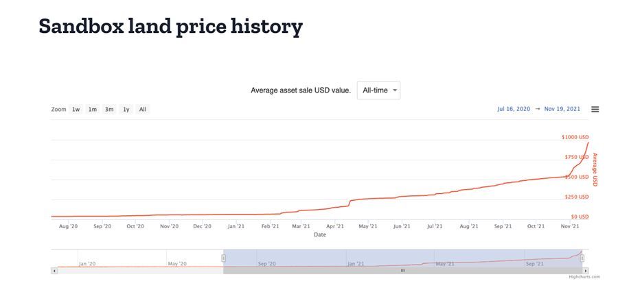 Here is a chart depicting the increase in the price of land in Sandbox from $40 in 2020 to more than $1200 in 2021.
