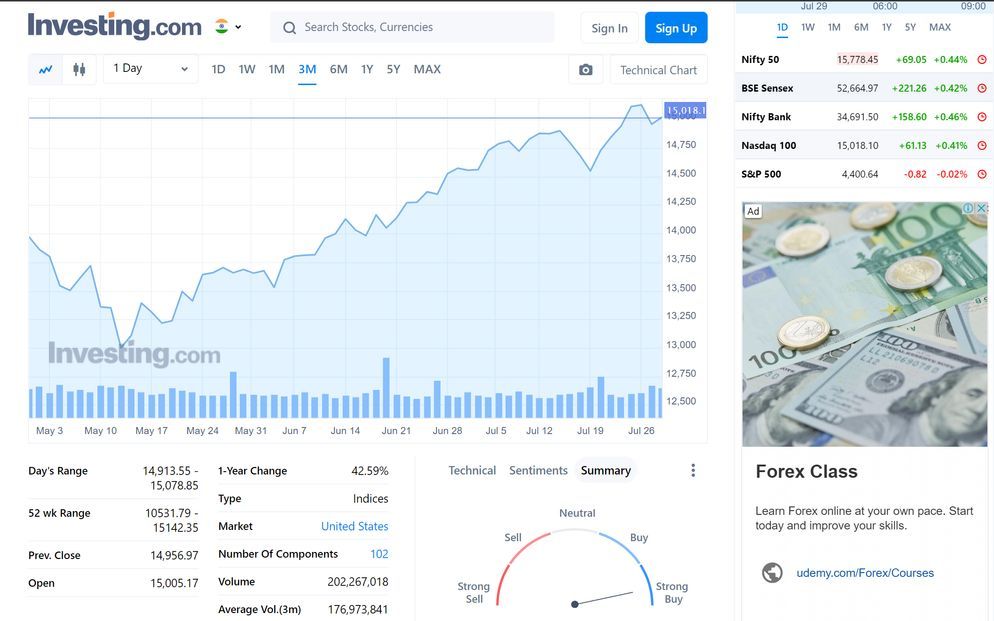 You can not only study stock charts but also Commodities, Futures & Options, Bonds, ETFs, etc of almost every exchange in the world. You could get the chart of NASDAQ 100 along with all the updates and summaries with it.