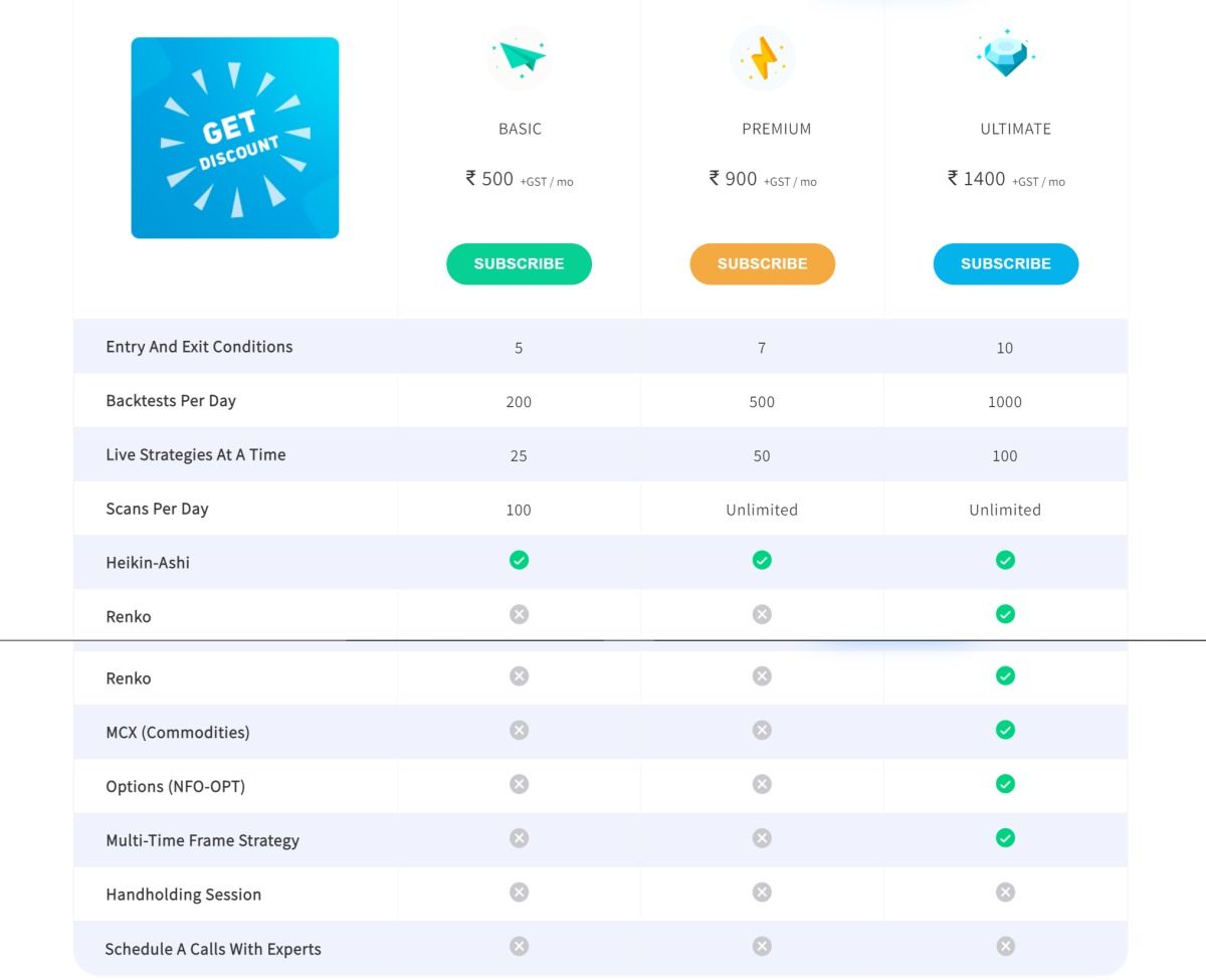 Although, Zerodha provides a 7 days Free Trial of Streak where one can backtest up to 50 trading strategies per day and deploy up to 5 Strategies in one single day. After the 7 days trial, one will have to subscribe to the different plans that Streak offers.