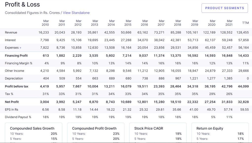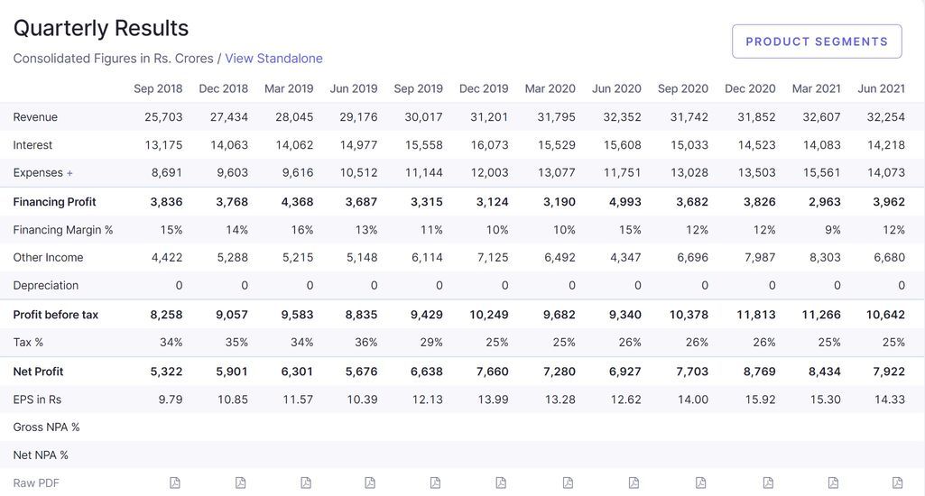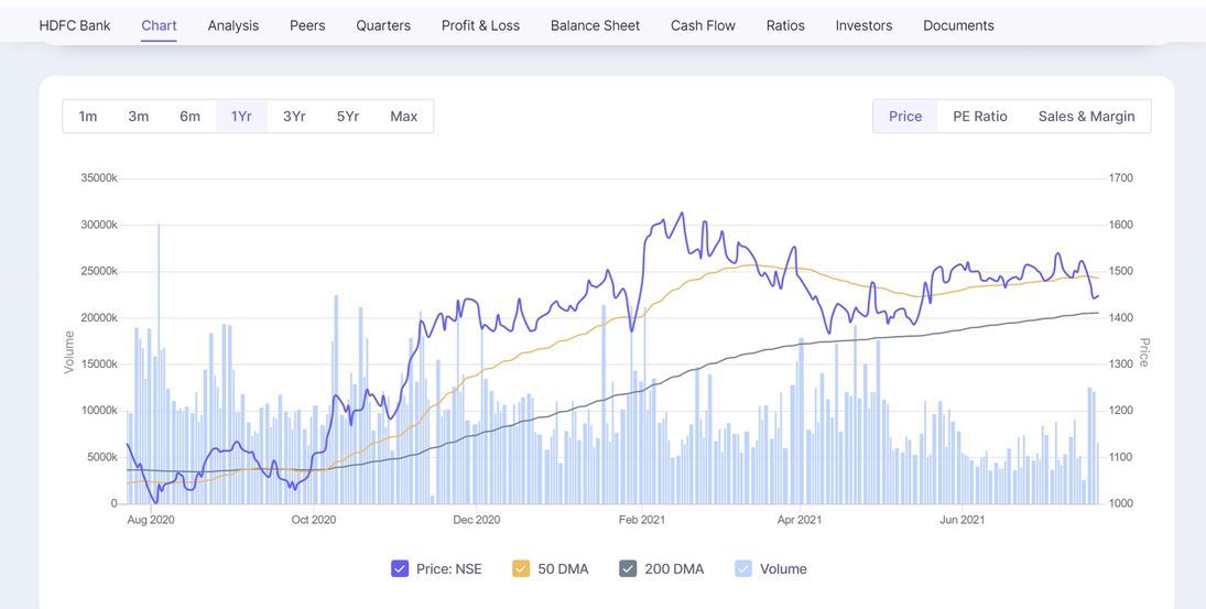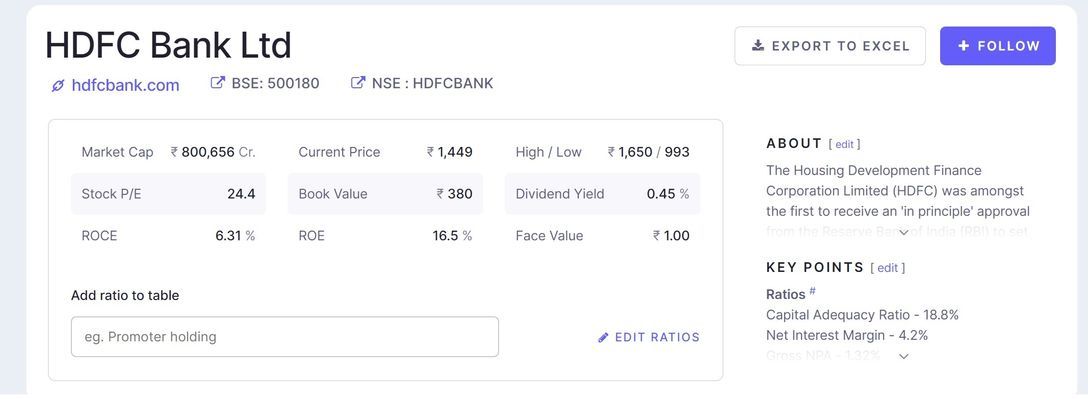 Let’s consider the example of ‘HDFC Bank’ and observe what are the different parameters in which Screener analyses a Stock.