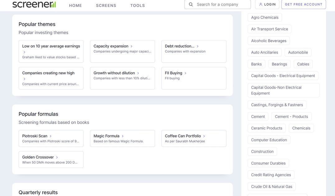 You can scan stocks based on numerous Themes, Popular Formulas such as Golden Crossover, Magic Formula, etc. You can filter out stocks from the latest quarterly results or Valuations like Book Value, Dividend yield, Highest Ratio of the Market value, etc.