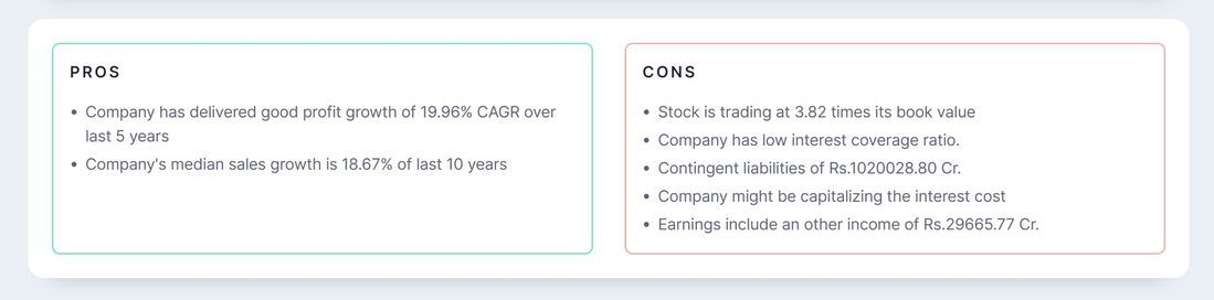 After the chart section, a brief analysis is presented on the stock. This is portrayed in the terms of Pros and Cons of the company. This is analyzed by taking into consideration all the important future growth prospects of the company