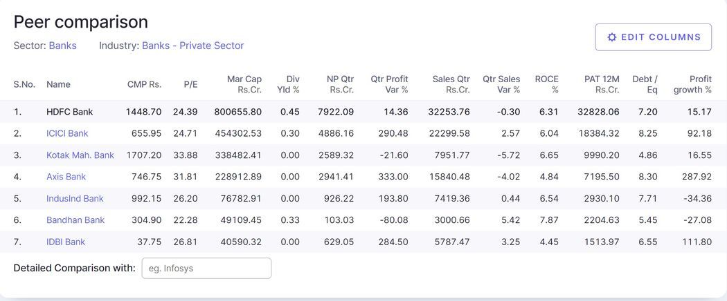 Screener has an in-build sector analysis tool that identifies the sector and industry the stock belongs to and provides a list of the valid competitors of the company. It compares the companies with the help of numerous financial ratios. This can be altered as per your needs to get the best possible results.