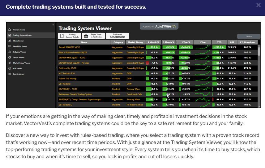 VectorVest provides a state-of-the-art, trading system that helps you to build discipline in trading as well as investing. If you get too emotionally attached or disturbed while in a trade, Using this trading system can remove those activities. The Trading System Viewer is a time-tested system that will provide the most favorable possible outcomes for your trading journey. It will tell you when is the best time to buy, which stocks to buy, sell stocks, or lock some of the profits.