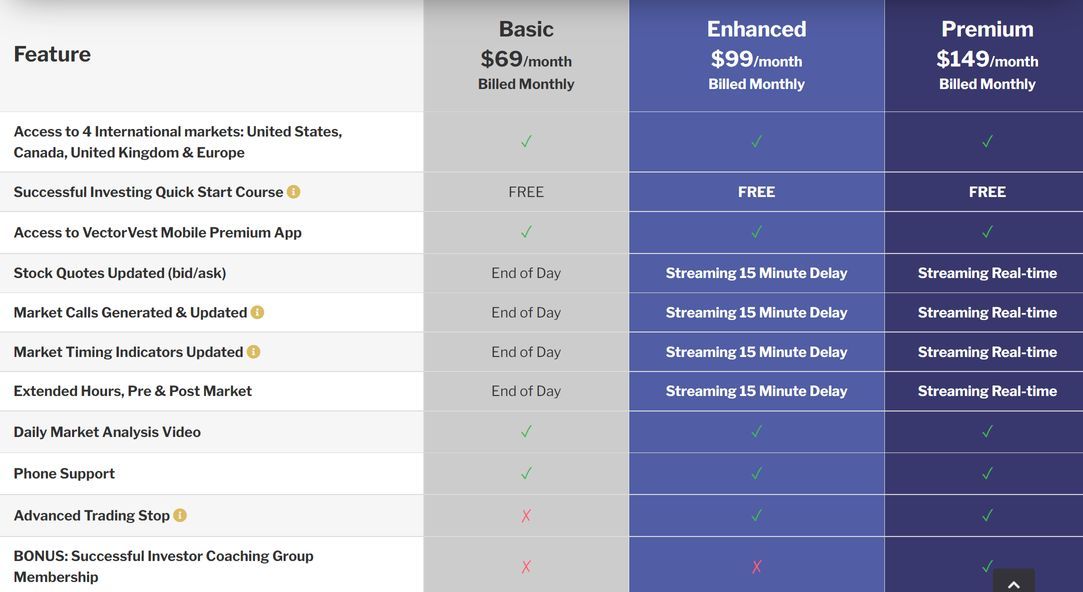 The ‘Basic Plan’ is the least expensive of all the three plans and provides the fewest features. Under the Basic Plan, the user gets access to 4 of the International markets as the two other plans. You also get access to the ‘Successful Investing Start-up Guide’ and access to the mobile application of VectorVest.