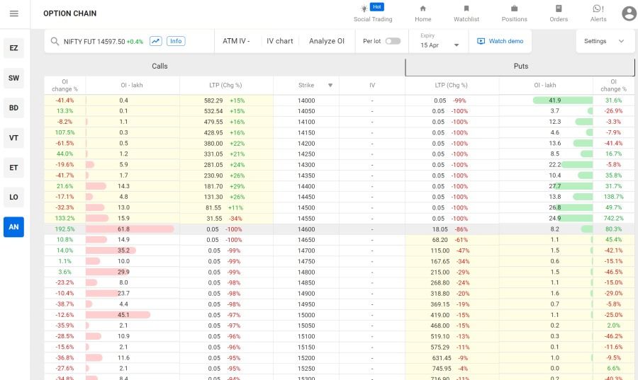 Yes, in Sensibull, you can get access to the Options Chain where you can get all the essential features such as ‘IV’, change in Open Interest % (OI), LTP of Call Options, and Put Options, and much more. The OI chart shows the total open interest in individual strike prices with the help of colored bars which makes it pretty easy to understand. To perform advanced OI analysis, you’ll have to subscribe to any of the paid plans, available on the platform.