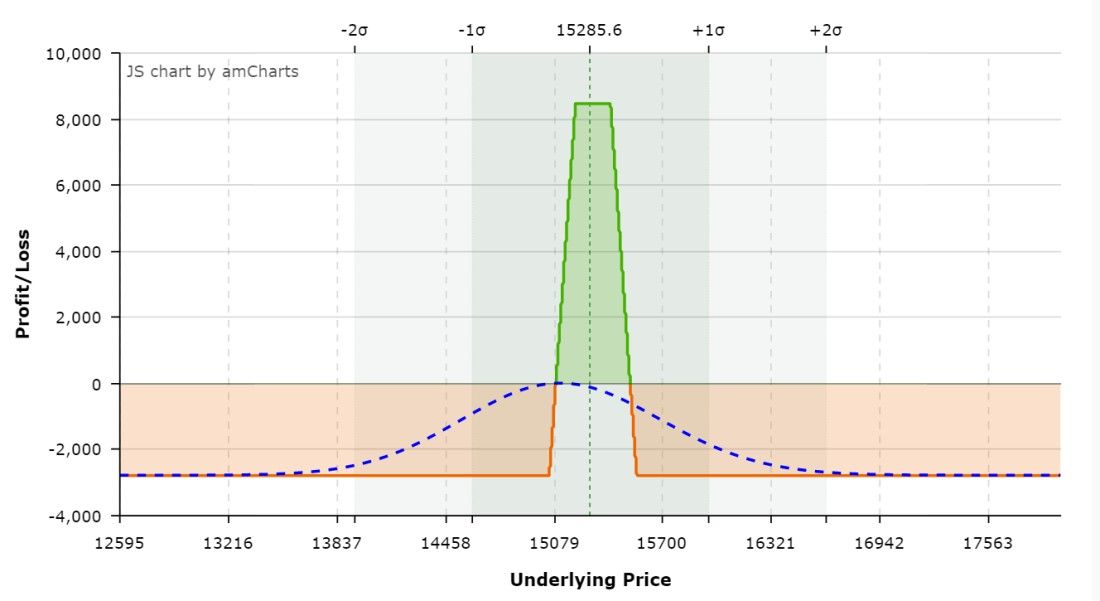 Iron Butterfly is a 4 legged option strategy that is also known by the name “Iron Fly”. This strategy is implemented by a total of 2 Call options and 2 Put options. First, an ATM (At The Money) Short Straddle is executed that involves selling 1 Call & 1 Put option of the same strike price of the same expiry. The second part is to Buy a slightly OTM (Out of The Money) Call option and a slightly OTM Put option to mitigate the overall risk of the Short straddle. This is implemented in a similar scenario as the Iron Condor but the trader expects the expiry around the Straddle sold in this strategy. The RR ratio in this strategy is better than that of Iron Condor.